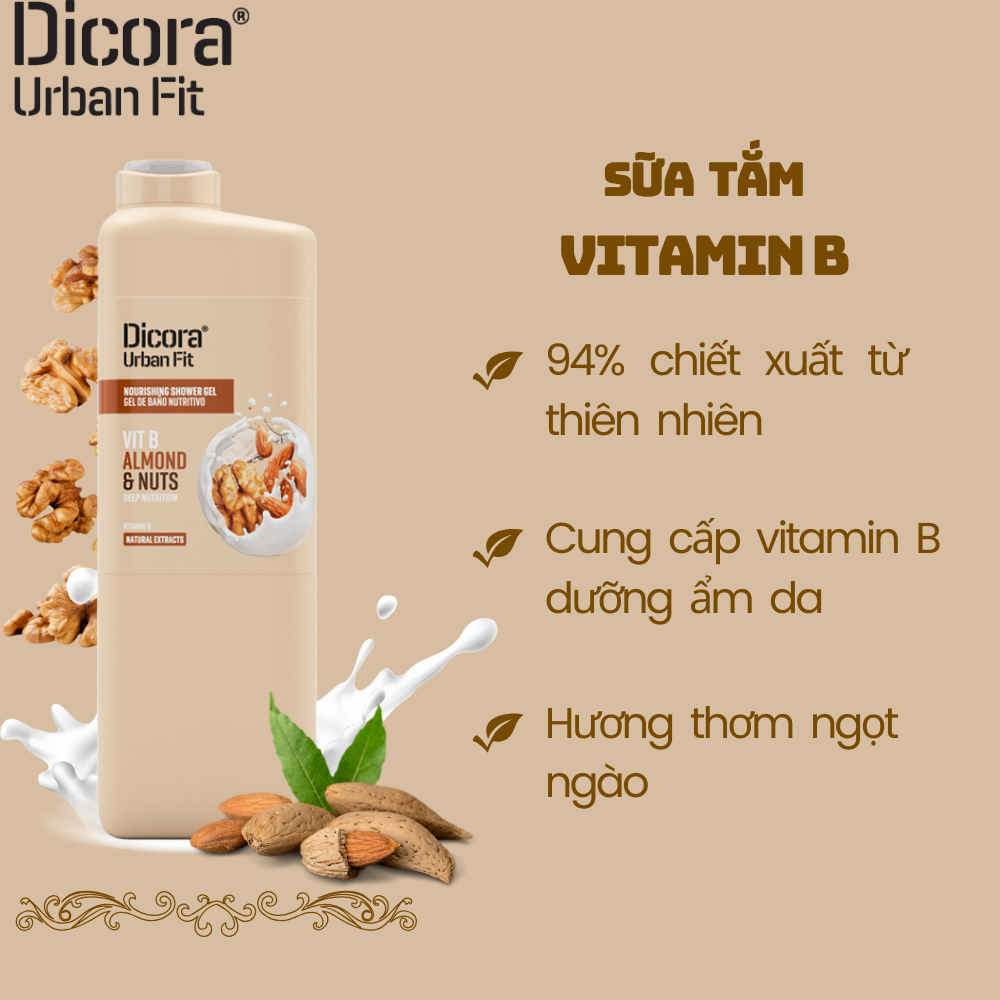 Sữa tắm Dicora Vitamin B Hạnh Nhân và Các Loại Hạt làm sạch dịu nhẹ, bổ sung vitamin B & dưỡng chất giúp da mềm mịn, sáng khỏe tự nhiên.